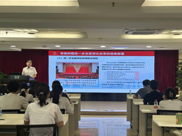 8月27日,华体会平台团委书记梁晨在广德大厦15楼会议室为各团组织书记、委员,本部及纺出公司团员青年,2024年新入职管培生共47人作学习贯彻党的二十届三中全会精神专题宣讲。在宣讲过程中,梁晨通过鲜活的语言、生动的案例,从深刻把握进一步全面深化改革的重要性和必要性,深刻认识进一步全面深化改革的指导思想和总目标、重大原则、重要部署,认真落实进一步全面深化改革的实践要求等方面深入浅出地对全会精神进行了系统阐述和解读。