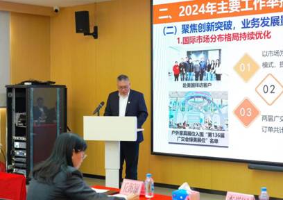 公司党支部书记、董事长周逊姜以《务实谋新提质效,深化改革促发展》为题作工作报告。报告从聚焦主业、赋能蓄力、培根铸魂三个方面总结了公司2024年的工作情况。2024年,广纺联公司统筹抓好地块交储、物业管理等多项工作,公司实现营业收入完成预算目标值103%;利润总额完成预算目标值156%。报告指出,2025年广纺联公司将围绕广州轻工集团及华体会平台的总体部署,紧扣“数智领航链全球,提质增效建新功”的工作主题,从紧盯主责主业、提升改革深化、坚持党建引领、加强风险防范、强化人才队伍建设等五大方面推动经营工作实现质的有效提升。