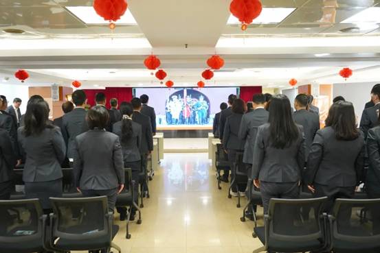早上8点,华体会平台党委书记、董事长简玮仪带领全体领导班子成员和各职能部门负责人在广德大厦一楼大堂,整齐列队热烈欢迎复工的员工,为他们送上新春的美好祝福。