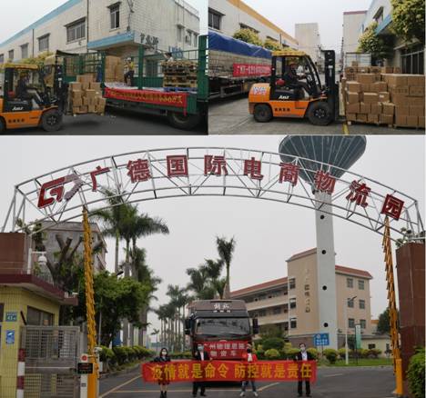 3月13日上午,在广德国际电商物流园,园区主营单位广州广德供应链管理有限公司协助园区内企业广州万一信息技术有限公司及广东柏俐臣生物科技有限公司及时将一批抗疫物资捐赠给湖北恩施州新冠肺炎疫情防控指挥部。